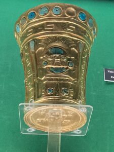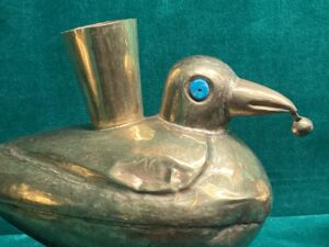 Very striking art piece is the drinking vessel in pure gold and decorated with turquoise representing the culture of the northern coast of Peru.