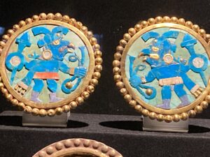 In Moche ear ornaments, we can see marvelous design using gold and turquoise. Gold was associated with the day and silver with night: the ceremonial gold and silver bowl belonged to Chimu, 800-1300AD.