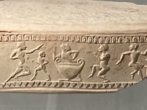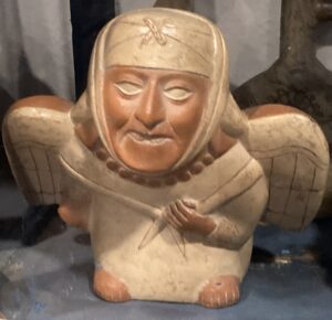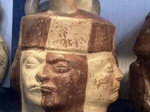 There are Nasca potteries on display that showing flying deities while carrying trophy heads.