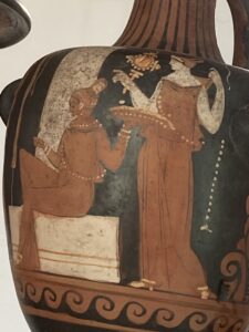 Vases in the shape of women’s heads is often present in the Canusian graves. Their heads were usually covered with the crowns and depicting a wide range of hairstyles and ornaments. Also there were the paintings of the winged women playing a variety of instruments. The artists used to portray each artifact with a specific facial expression to convey the feelings and emotions. At the end of funeral, the artifacts were left in the graves to safeguard the deceased throughout the journey and sometimes they were considered as means between the living and the dead. These artifacts demonstrate the gradual assimilation of funerary customs typical of the culture of Rome. The aristocracies of Canosa had formed alliances with this culture since 318 B.C.