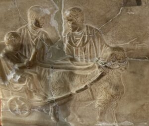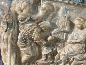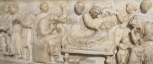 The marble sarcophagus discovered in1975 in the Roman cemetery outside Porta Aurea demonstratng the story of a family from 1800 years ago in the ancient city of Agrigento. It shows the mother and the father caring for their small child and they are surrounded by other Roman figures.