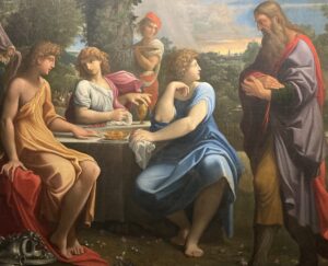 In this beautiful painting by Carracci, three symbolic angels sitting on a table in a garden. There are golden plates and berries on the table and the angel in blue dress is talking to Abraham while two other angels are deliberating. The blue angel is the main focus of the painting; the visitors’ eyes are drawn to him. Sarah or Keturah is seen watching from the tent. And there is a young man who could be Ishmael is standing near the tree.